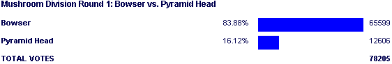 That has to sting a little if you're a Silent Hill fan. The only thing that could really be taken from this match is that Bowser looked to be as strong as ever before; ideas of new voting patterns taking place in this contest as opposed to any other were floating around, but they had yet to actually be confirmed. It would take quite awhile before these ideas were given more sufficient proof.