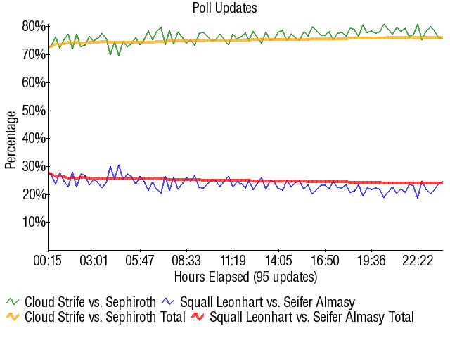 7 years made a .06% difference, although this really did help lay out how screwed Cloud and Seph were next round. Putting Cloud and Seph on one side while pairing Squall with a total fraud should have increased Cloud's percentage by a lot, but it didn't. People only really saw this poll as FF7 vs FF8, nothing extra, and Cloud/Seph needed a lot of "extra" to have any prayer of beating Link next round.
