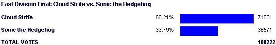 The Sonic fans that remained pissed off after what happened against Samus in 2002 were ready to go for this match, and for a few seconds they were effective. They were actually able to take the board vote from Cloud, and Sonic was ahead for a tiny little bit.