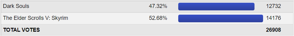 When the poll got past 11, Skyrim finally decided to go "F this shit" and end this match, turning a 100 vote lead into 200 in all of 30 minutes, and after one final last gasp from Dark Souls, where our boy cashed all the souls in and made one final run at Paarthurnax, Alduin, and all 13 daedra, Dark Souls fell. Skyrim increased the percentage from 51% to 52 overnight, and that was that. It was an incredible first few hours, but Skyrim would ultimately win by almost 1500 votes.