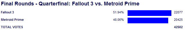 Unfortunately for Prime, it never led beyond the first hour. It would be nice to say Prime had a great lead and only lost because of the morning vote, but Fallout 3 started pushing a lead once the crazy Prime power hour ended, and it shook Prime off for good a little while later once the night vote started. Prime is a western game through and through and had almost no success anywhere else, so it was expected Prime would start falling off overnight a bit faster than other Nintendo games might have. Prime may very well have won a day/24-hour match, though, and it's just one more reason we need to start having 24 hour matches a round or two earlier. If you win 4 matches and make it out of your division, you deserve a full 24 hours to win or lose.