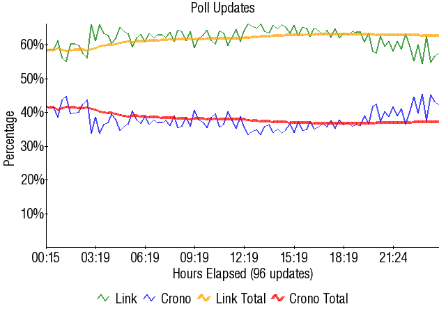 Yet again, the only thing to draw from this match was how Link would do against future competition. Yet again, Link looked like he had the clear advantage against Cloud in the finals. If Crono could only manage 37.18% against Link (which would have been lower had Crono not made a small recovery in percentage late in the poll), which is lower than what Mario managed to get on Link in 2002, then how was Cloud going to take Link down? It was blatantly clear after this match that Link went up, simply because an improved Crono did worse against Link than 2002 Mario. We could have easily called the contest after Link's massacre of Yoshi, but holding Crono to under 40% is a scary, scary thing. It was nice for Crono to finally take down Mario in getting here, but Crono learned on this day that he has a long way to go if he wishes to take down the more elite characters of the contest.