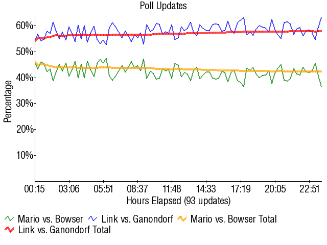 It was okay for a little while when a combination of bracket voting and Link anti-voting led to Mario winning early, but it didn't last. The silver lining though was Mario finally breaking 40% on Link, which was nice to see. So even though Link won the war, Mario finally won a battle against him.