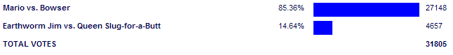 Mario vs. Bowser - 83.05% 112 for - 0 against |