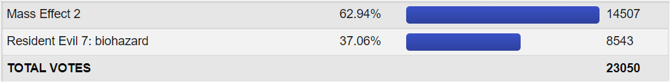 So for the match. I believe RE 7 did good here. But well a 1 seed going against a 16 seed what do you expect? I believe only 1 time a 16 seed won in all contests that have happened on this site and that was 16 years ago. Still ME 2 did as expected so I guess all are good? Eh we shall see. Oh first match on this contest that I have played BOTH games! Also pretty sure RE 7 is the strongest 16th seed of all 16 seeds on this contest. Too bad for placenement. Couldn't we have an indie game that nobody cares here?