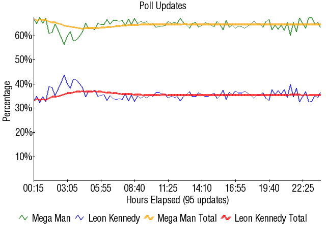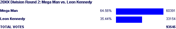 Granted I'm writing the conclusion before the hypothesis, but come on, this match was consistent. And consistency in a contest match = boring. The only thing of any note in the match itself is that Mega Man began the poll over 70%, then slowly fell to hovering over the 64% level. For the entire second half of the match, Mega Man stayed between 64.53% and 64.7%. There isn't a whole heck of a lot to dissect with those numbers other than Leon doing better than many people expected him to.