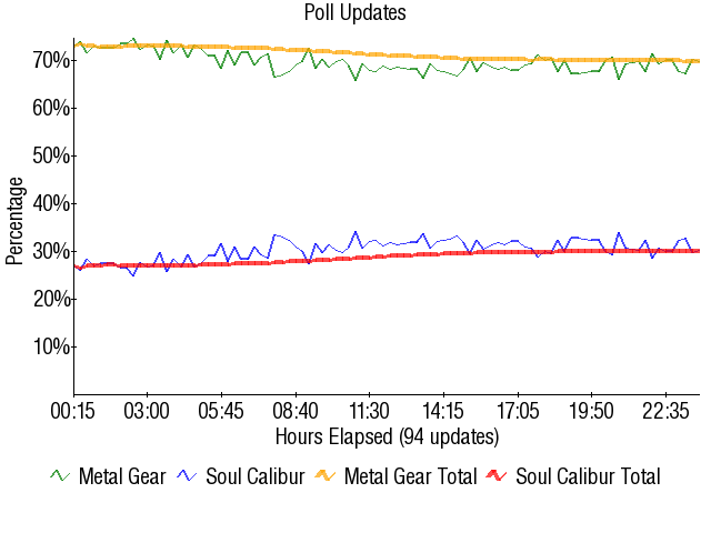 This match would be the first of many that would help prove it. SoulCalibur was never in this match at all, and though MGS would start over 70% before falling to what you see above, this fact is irrelevant. One would assume that SoulCalibur would have gotten something like 40% given its Spring 2004 stat position. It never came close, and the bar was set for other series from Division 128 to bomb as well.
