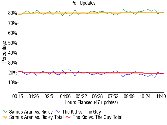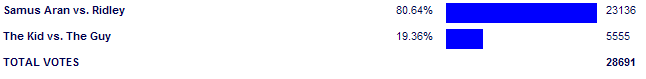 I know I've overused the line about 80% being difficult to get to, but it really is. This contest was tailor-made for Kid and Guy to do well -- good rivalry, popular game on this site -- and Samus just wrecked them. A lot of people felt like Ridley would hold Samus down and potentially hold her back from her 1 on 1 strength, and maybe they would end up being right, but there was no indication that was possible after this match.
