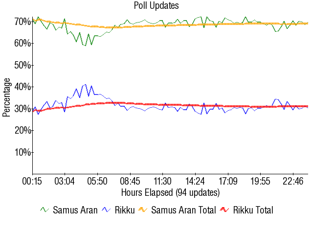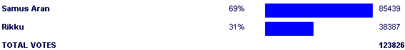 Always nice to be in the third round of a contest and have a horribly predictable match going on. Samus beating Rikku was never in doubt, and this was one of those "How much % will the winner get?" deals. The only notable thing is that even third-rate Square vs Nintendo matches draw high vote totals.