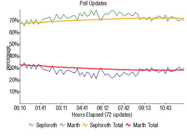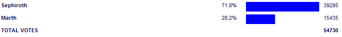 This match was pretty much Cloud vs Ridley, but with two lesser characters. Sephiroth started out with the standard terrible board vote, then rose overnight to almost the exact same percentage Cloud got.