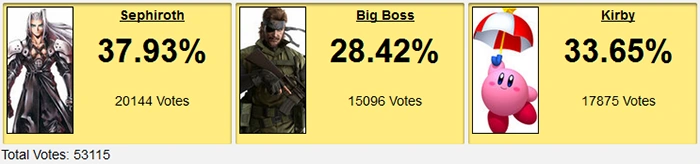 The morning vote came alright, but it was Sephiroth that went running with the match. He turned what had been a 5 hour tie into a steady rise, and would end up winning by 2269 votes. Things may have been really close for 5 hours, but for the other 19 there was barely any resistance at all, which really surprises me because while FF7 has a good day vote, Kirby doesn't exactly have a bad one. But that's this contest for you, making no sense whatsoever.