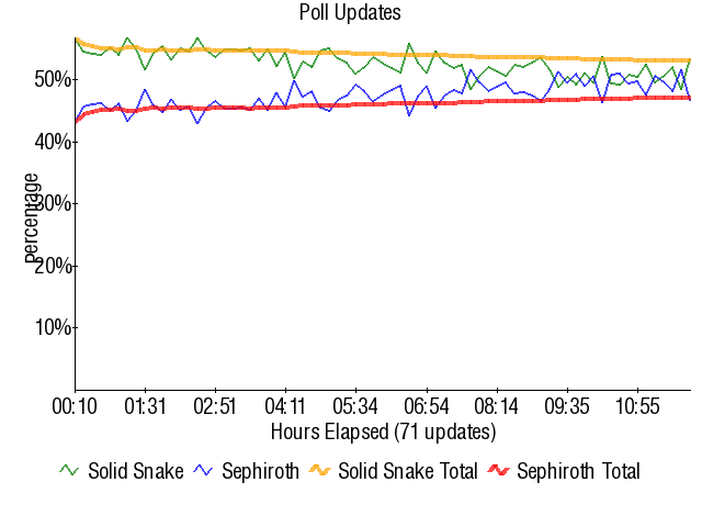 Not only that, Sephiroth was bound to lose the board vote worse than usual because of beating Missingno. Sure enough, Snake jumped out to some ridiculous early lead along the lines of 25-1 and never really looked back. This was as dominating a performance one can get from a 53-47 win, and this came during a day match. MGS sucks during the day, and FF7 is actually better overall during the day than at night. Night time only looks stronger because of the Total Domination Zone. If this were a full 24 hour match, it would have gotten worse for Sephiroth. A lot worse.