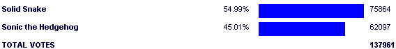 This has already been discussed, but something really flukish happened with the Snake/Mega Man/Sonic trio. Mega Man tanked the entire contest while Sonic looked as strong as he always has, yet it took Sonic over 15 hours to get a higher percentage on Snake than Mega Man. Something doesn't really add up, and I think it's entirely Nintendo-related. Mega Man's fanbase is largely Nintendo, while Sonic's is less so. If you ask me, Mega Man overperformed on Snake by a fairly decent amount thanks to the main reason for Snake's boost (Brawl announcement) being much less of a factor given Mega's fanbase. rSFF, if you will. And then there's the whole thing about Mega Man being stronger than Crono in the stats following this contest, which makes zero sense given their match last year.