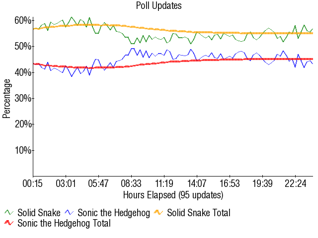 When the match restarted error-free, Snake made Sonic look worse than Mega Man, and by a hefty amount for a damn long while. Sonic was all the way down to 41.75% at one point (Mega finished with 44.67% on Snake) during Snake's downright sick night vote push, and it really did look like Mega Man would be able to save some face.