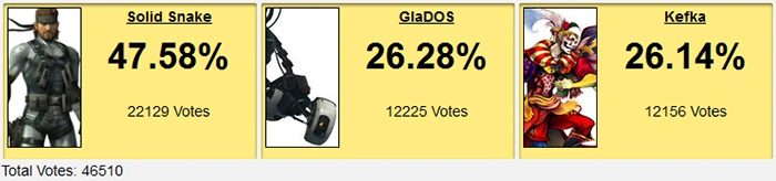 As a result of the rallies, GLaDOS probably got a huge boost from people who just play PC games. Although shouldn't Kefka have gotten some kind of boost if Sephiroth did? Again, 2013. I still don't get how the fuck this happened.