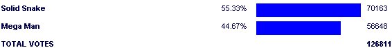 I stand by the topic I made during this match; Mega is the frontrunner to be the one that breaks the Noble Nine. Between how stupid Capcom is and how Mega is already starting to be forgotten, nothing short of an appearance in a Smash Brothers title is going to save him. And what's funny is that because Mega is essentially a Nintendo character in these contests, this match could have been far worse. But since most of Snake's boost came from the Brawl announcement (the show-stopper at E3 2006, not to mention GameFAQs), Mega Man was able to tap into a little Nintendo magic and save a tiny bit of face. I mean after all, he won.... two updates, I think =p