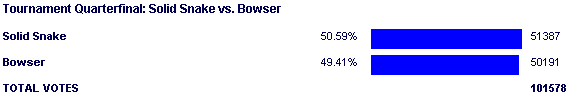 Personally, if this same match takes place assuming the nonexistence of Metal Gear Solid 3, I still think that Bowser could have won relatively easily. I don't think that the underperformances of Ocelot, Liquid, and even 2004 Snake were all a fluke. Though with that said, this match took place after MGS3 and despite a little bit of a struggle, Snake won fairly easily. I say fairly easily because I'm one of the many that now thinks that Snake wins by a wider margin if he isn't (for once) screwed by his match pic. His match with Sora was the one time he had a pic that did him justice, and look at how well he did with it. As it stood, Snake finally was able to earn the Final Four spot that had eluded him for three contests prior to this.
