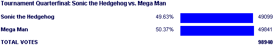 There Sonic was, on the brink of a huge comeback and perhaps finally getting rid of the Samus 2002 ghost that has haunted him, yet he couldn't seem to get over the hump. The evening vote was dead even for both characters, and they remained deadlocked at a difference of around 300 for hours. The longer the stalemate dragged on, the better it was for Mega Man's chances to pull this thing out. This was confirmed by the second night vote which Mega Man, not Sonic, used to break the deadlock and pull away once and for all.