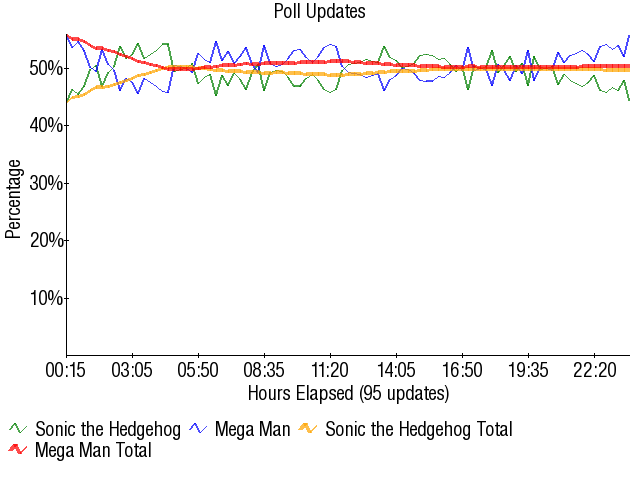 When the match finally began, it almost didn't live up to all the hype. Mega Man jumped out to an extremely fast early lead of a few hundred votes, and by the time Sonic began to stall Mega Man he was down by almost 400 votes two hours in. But Sonic was able to recover, and after a little bit of stalling the traditional Sega morning vote kicked in and gave Sonic a push for the lead. It took Sonic a long while to erase those 400 votes as Mega Man was no slouch, but after about two and a half hours of scratching Sonic was able to tie Mega Man before taking the lead for himself. It looked as if that morning vote would allow Sonic to take off like a bullet after Sonic's lead went from 19 to 72 a mere ten minutes after taking the lead, but Mega Man was somehow able to recover during Sonic's best time in the poll. Mega Man was able to completely stall Sonic and stay deadlocked during a time in the poll in which everyone figured that Sonic was about to go on a killing spree, and much to everyone's shock Mega Man was finally able to recover and take back the lead for himself. After Sonic tried his best to stall Mega Man from doing anything, Mega Man took off and increased his lead from the teens to the hundreds within two updates.