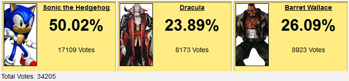 And though Barret did end up getting second place, this was such an embarrassing performance. Dracula kept virtually tied for 20 minutes before very slowly losing ground the rest of the match, but even with FF7's so-called good day vote Barret only won by 750. I know RacistFAQs and all, but Dracula is seriously only in Symphony of the Night for like 5 minutes. He may have gotten extra votes for also being a historical figure, and holy crap do we need to have an all-inclusive character contest like nothing else because the strength of guys like Batman and Vader need to be tested, but Barret still should have won with ease.