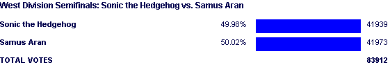 But despite the clear spamming, Sonic continued his methodical lead gain through all of Samus's best efforts. Samus did an amazing job staying close, but in the end, Sonic and his iconic status proved to be a bit much for both Samus and the advertising going on on both sides. Despite all of Samus's best efforts, she found herself down by 1500 votes at 10 PM, with 3 hours left in the match and the Nintendo voting block all but gone completely. It was little more than a walk to the end for Sonic at this point, and even though Samus gave Sonic the fight of her life, the fact that Samus had not starred in a game since Super Metroid clearly hurt her in this match. Maybe if this match had taken place two years later, Samus may have done better, but for now, she simply wasn't strong enough to hang with the likes of Sonic the Hedgehog and his amazing lineup while not having a recent lineup in her own right.