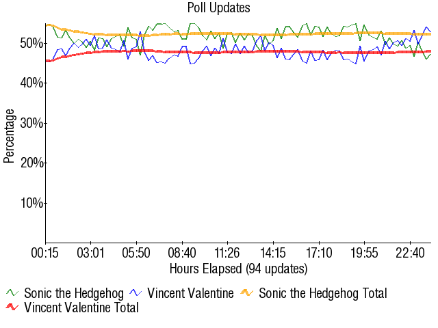 This was an interesting little match, though the final vote margin is a bit misleading. Sonic was never really in danger of losing this match, though all the people desperate to see the NN break were certainly rooting for such. That all ended minutes into the poll, when Sonic had a comfortable lead that he would slowly build on through the night. Vincent managed a few stalls and minor update wins, but all drama was gone once the standard Sega day vote kicked in and buried him. Vincent did manage a bit of face-saving in the end, chipping off a couple hundred votes in the waning hours.