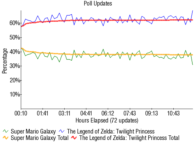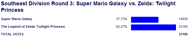 On the surface this match looks like Mario Galaxy disappointing as usual, but you have to realize no one outside the casuals expected that game to do well in this match. For it to flirt with 40% for a time against Zelda in a match where a repeat of the Ocarina > Mario 64 killing from 2004 was possible was a moral victory for Galaxy. It definitely came out this contest with a mix of 1 seed respect (just look at those battle stats and bracket predictions for proof) and contest title boost, and it showed during its loss.