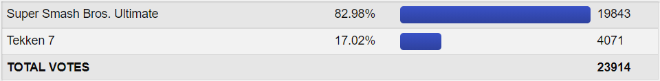 So for the match. Let's be real maybe 1-2 games can challenge Ultimate on this contest and maybe even that is high. So a slaughter as expected. As for Tekken 7 it can beat some indie games from the bracket for sure. But then again not everything can go against weak indies. But well yeah we don't care for fighting games not names Smash in this site. Characters are a different story but even there they all mostly suck anyways.