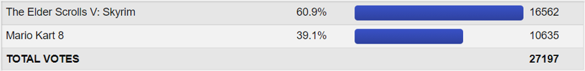 Instead, we got a repeat performance. If you take the Witcher 3 vs Galaxy 2 match trends and put it up next to Skyrim vs Mario Kart 8, you get practically the exact same match. It's cute and funny to look at and such, but it also meant more confirmation of the obvious -- Witcher 3 was a cut above Skyrim for this entire contest. If only we knew that going in, huh? For the first five minutes of this poll, Mario Kart 8 made a match of it. For the final 23 hours and 55 minutes, Skyrim buried Mario Kart 8 to survive and advance. I'm happy Mario Kart 8 booted the MMORPG trash out of this contest, but it doesn't mean I enjoy any of the Mario Kart games. I just hate them less than I do MMOs. To that end, it was nice seeing Mario Kart 8 gets its teeth kicked in. Screw all of those games for life.