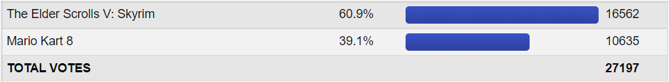 Okay this match was strange. Not because we didn't knew who would win, I mean Skyrim is in Top 5 Contest games for power of course. And almost everyone has it reaching the semifinal match and a lot have it reaching the final match. So yeah no worries there. The problem was what percentage it should have to be considered the favorite to reach the final match. But in my opinion no matter how Skyrim would win here, it would be considered bad except if won with like 70. So yeah don't know what to say.