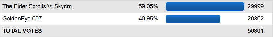 GoldenEye is a strong game here, there is no denying that, but Skyrim is really legit and proved that for real today. It didn't look too hot last round, but this is pretty great, especially for a recent game. I don't really believe this match should have been in any doubt pre-contest, but after we slowly discovered just how much recent games suck, it's nice to see one of them not doing so. Can you imagine how strong Skyrim could've been if this wasn't NostalgiaFAQs? Look at Fallout 3 in Game of the Decade. It was the #1 seed overall and reached top 4. I fully believe Skyrim would be even stronger than Fallout 3 if more new users voted in these polls instead of only visiting answers and board pages. Regular poll of the days also suggest that Skyrim would be stronger than Game of the Decade Fallout 3. If we get another Game of the Decade contest in 4-5 years, I think Skyrim would be the overall favorite to win at this point, unless a really appreciated Nintendo game on NX comes out or a rally wins the contest again, and I hope we a contest like that because it was really great last time!