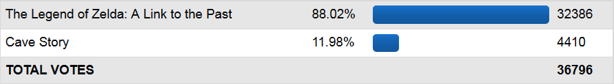 Here we have the second biggest blowout of the contest and thus a short write-up. A Link to the Past was one of the contenders for second strongest game on out site pre-rally and it certainly looked today like it might just be that, but it's also possible Cave Story is just that weak. However, with this being Year of SNES, A Link to the Past might just have gotten the push it needed to possible threaten Final Fantasy VII and RBY for the title, though Chrono Trigger would still rival it. Of all the games that could possibly be the second strongest game, A Link to the Past was the only one put in the bottom half of the bracket, so we wouldn't really get to know. On one hand, it's a bit of a shame, because it would be nice to see just where it stood compared to the other contenders. But on the other hand, it's kind of nice that we avoid as much Zelda domination as possible, but putting the three strongest of them as close as they could get by their seeding. Some games are gonna get wasted to them, but that can never be completely avoided. It wouldn't be an issue if we had contests more often though. Then we could easily have this now and then set up Chrono Trigger vs. Link to the Past rematch next time or something, but you never know when next time will be.