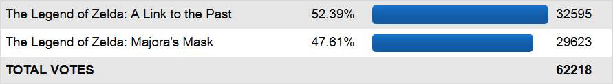 One can argue how close LTTP and Majora's Mask are "supposed" to be normally (which is logic I will never agree with, but whatever), but I think most people agreed that Link to the Past would easily win this match with minimal interference. Well for an hour and a half, Majora's Mask put the fear of god himself into Link to the Past. All that rallying that was going on in the previous match clearly favored Majora here, and Majora rode the wave all the way up to a 600 vote lead 90 minutes into the poll.
