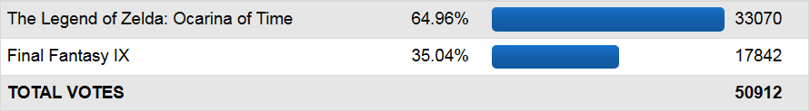 Anyway, it does have solid contest strength now, so for someone like me who doesn't get why its so popular all of a sudden, it's just exciting to see it in action in these contests. It that sense, it feels kinda wasted going against Ocarina of Time, but at least it provided a highly entertaining first round match. It also got to embarrass Ocarina of Time in the eyes of the average contest follower, though I don't think Ocarina of Time looks too bad today. The Suikoden II match was worse in that regard, but I'm still willing to believe Suikoden II got stronger. If you believe Final Fantasy IX is about equal to Final Fantasy X now, then it's not too bad. This is around what we adjusted Final Fantasy X to get in Ocarina of Time in 2009 and quite a bit below what it's expected to get against it in 2004.