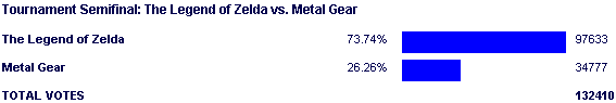This match is also pretty funny, now that I look back on it. There were two days left in this contest, and there were literally no signs of the pending shock upset we were two days from seeing. Sure Zelda performed to insane proportions to this point of the contest, but so did Final Fantasy. And though Zelda coming out and beating the hell out of Metal Gear was something everyone knew was coming, it wasn't the TOTAL killing that we had grown accustomed to seeing from Zelda in this contest.