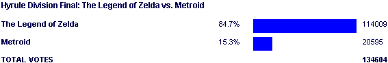This is seriously the easiest match in the entire contest to look into, because everyone knew it was coming -- especially after Metroid bombed against Pokémon in the previous round. I doubt most people expected the SFF to be this bad, but it wasn't a surprise regardless. Metroid fans are used to all things Samus bombing against Nintendo, as are all fans stuck having their favorite anything face Zelda in a contest.