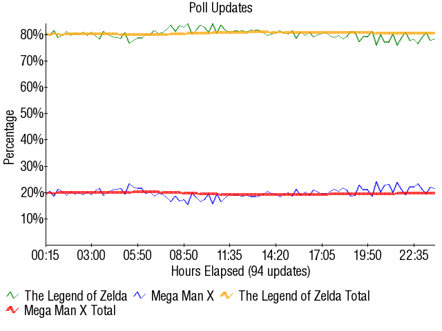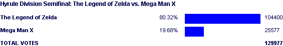 As for the match itself, the game of "Can you top this?" between Zelda and FF was officially on at this point. It's one thing to blow away Civilization in a Colossus vs Fodder match, but quite another to have record vote totals in an SFF match. How "Nintendo" MMX is and whether or not it causes pure Nintendo SFF can be argued by the stat mongers until the end of time, for all I care. This match was a clinic that proved Zelda was far from unable to take Final Fantasy down, though unfortunately between that and the match pics, there isn't much else to say. Just lots of watching and waiting.