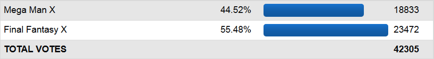 Things were bad right from the start for FFX, when it was only at 57% at the freeze. MMX then proceed to thoroughly embarrass FFX for the first couple hours of the poll, including even getting a couple of cuts, before FFX recovered during the dead zone (Square's best time) to get things back to 57%. Then the morning vote hit and MMX started going up again, including getting even more cuts throughout the match. MMX was never a threat to win, but any hopes FFX had of beating Chrono Trigger just completely died after this match. This was a horrible win for Final Fantasy X, one of the worst wins of the entire contest, and even then it still didn't prepare people for just how badly FFX was fucked in round 3.
