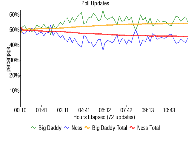 Sure enough, Ness did very little early on in the match, even with bracket votes and the Nintendo Power Hour. His lead peaked at 100 15 minutes in, then Daddy decided enough was enough and drilled the brat right in the face. No messing around. Just one punch, right in the face. Took awhile for him to put Ness away for good after that, but in an hour or so Ness gave up the ghost. The final numbers aren't really indicative of how close this was early, but that happens a lot in these.