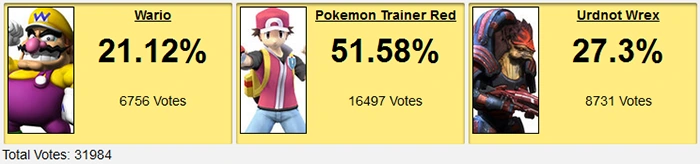 This was a cool result. Why does Wario do like shit in these things? Yeah, he's not fodder, but it seems he's entirely carried by just being fairly well known but nobody really likes him enough to vote for him against better characters.