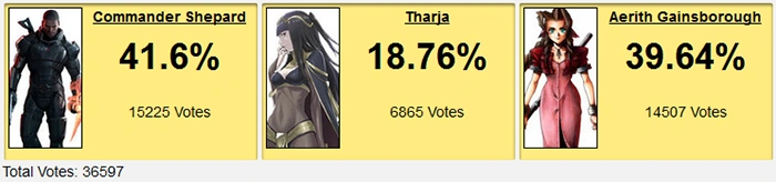 Early on, Aeris was winning. Either she's more popular than Shepard by herself, or bracket voting put her ahead, or what. She stayed there for quite awhile, too, but never really built a lead or pulled away. While she was going up for the first couple hours of the poll, the biggest lead she managed was 137 votes. But in no time at all, Shepard began coming back with very little resistance. It only took him an hour and a half to get rid of Aeris's lead, and once he tied the poll he just took off. Usually when a favorite is losing a lead, there is a ton of resistance and a tie holds for awhile. When Aeris lost the lead, she just died.