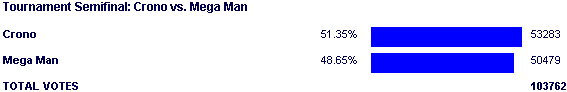 Unfortunately, Mario/Crono IV was given far too much hype through Crono's beating of Mega Man. Mario was clearly stronger this contest, while Crono and Mega Man were not. Earlier I said that the winner of this match had to flat-out kill the loser to stand any chance against Mario, and winning by less than 3000 votes does not accomplish this. One could easily argue that Mario won the contest back when he beat the hell out of Samus, but the only thing left to do from here on in was to actually hold the final and see what happened. Crono still had a relative chance to win, but it was not a good one.
