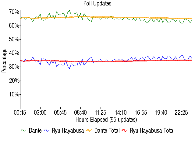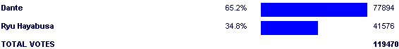 Can't get more badass than that pic, can't get more boring than this match. According to 2005 stats, Dante was supposed to beat Ryu with 63.72% of the vote. As you can see, he did 1.5% better. He could have finished with a higher percentage, but he lost some percentage in the second half of the match for whatever reason.