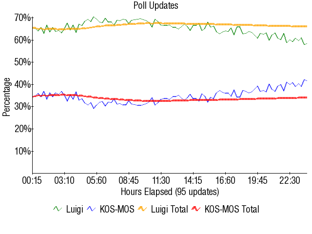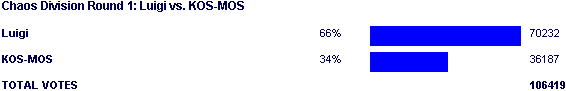 So what does Luigi do? Not only does he completely crap all over the KOS-MOS, he completely craps all over the stats. He came out with over 70% of the vote in the match, and even though his percentage leveled off not too far later, he still finished the match close to doubling a character that he was supposed to have a close match with.