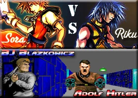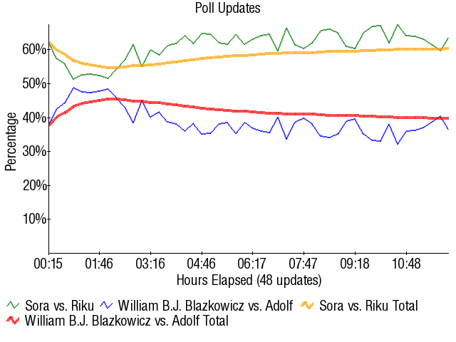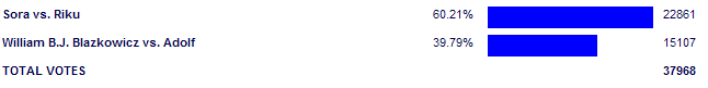 This match was destined to be the 4chan target of choice, and for a time they didn't disappoint. They even had the picture advantage, because holy crap did Soraku look like garbage. Soraku started over 60%, fell all the way down to 54% with rallying, then people noticed the rallying wasn't working so they went back up to 60%. Hitler was never really in contention to win this match, which is honestly a good thing. I'm all for a good joke, but Hitler making some L-Block run would have been really offensive to me and a lot of other people. I know he's made to look like a total joke in Wolfenstein 3D, but it's the principle of the matter.