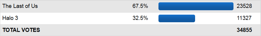I know there was a few people believing Halo 3 could pull this off, but I don't the match ever should've been in doubt. Sure, Halo 3 beat Super Mario Sunshine last time, that's not exactly a big accomplishment, people really dislike that game, sadly. I personally find it to be really great! Anyway, Halo has a bad history on this side. Master Chief made a dream run in 2007, but that's about it for good things the series has done here. The original Halo ended up not looking terrible in 2010, but it was not particularly great either. On the other hand, The Last of Us has been extremely well regarded. Very impressive for a new IP too. We expected it to be among the strongest games made in this decade, rivaled only by Skyrim and ME2.