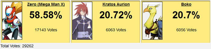 It's not that people hated Kratos or Boko. Far from it. Zero's just so much stronger than both that their battle for second place was fighting over scraps. Board 8 loves both characters however, but probably Boko more since we have a user named MajinBoko. It was the perfect storm in Boko's favor, and off he went to a 150 vote lead early. This was surprising by itself given Kratos was favored to win, but Kratos was able to slowly (VERY slowly) push that lead back down and tie the poll at around 10 pm with two hours left.