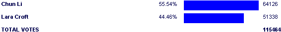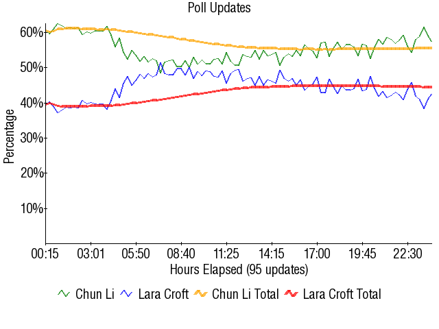 What's funny is that for awhile, it looked like Chun-Li was going to rip into Lara like most everyone before her. She was at 61% and climbing fast early in the match, but then the sad Street Fighter day vote kicked in. Chun bled percentage all through the match and finished with a mere 55-45 win over a washed up hack. Sad effort no matter how you view it, and Chunner's once-viable upset bid over Yuna died after this match.