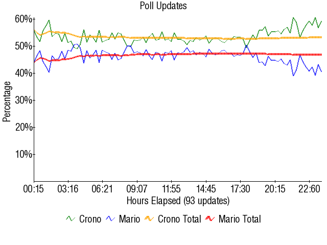 Sure enough, the match was over right after it began. Crono jumped out to an early lead, and despite Mario stalling Crono's after each gain of 100 that Crono made in the match, this pattern continued for the entire match. Crono would simply gain 100 votes, deal with a minor push from Mario, then gain 100 more. This was the entire match from start to finish. Boring, isn't it?