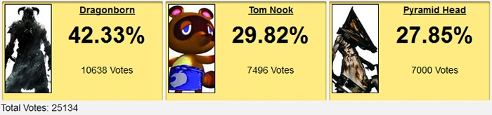 There was also a decent match for second here, even though it was never really close. I'm not sure if I should be impressed by Tom Nook getting second place here or not, but Pyramid Head turning a 650 vote loss into a 500 vote loss has to mean something, right? Dragonborn probably overlaps with Pyramid Head a tiny bit, too, so it's not like a 1v1 between those two losers would be predictable. We can only hope to never actually see a 1v1 match between freaking Tom Nook and Pyramid Head, though.